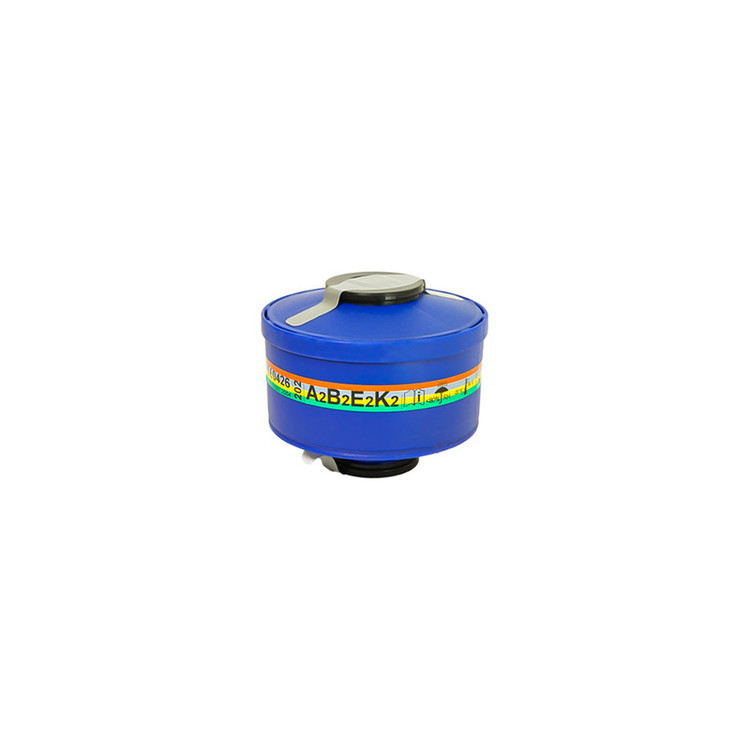 فیلتر ماسک شیمیایی 4 حالته اسپاسیانی مدل A2B2E2K2 جاذب گازها و بخارات آلی ، گاز ها و بخارات غیر آلی ، سولفور دی اکساید ، هیدروژن کلرید، آمونیاک می باشد. فیلتر با استاندارد EN 14387:2004 در بازار عرضه شده است. این فیلتر 4 حالته گاز و ذرات را فیلتر می کند. همچنین قابل استفاده برای ماسک های شیمیایی و ماسک هایی که قابلیت اتصال پیچی دارند و نیز ماسک های TR82,TR2002,ST85 مناسب است. بدنه فیلتر از جنس پلی پروپیلین وبه رنگ آبی تولید شده است. فیلتر قابلیت شست و شو و قابلیت تعویض ندارد. درجه محافظت فیلتر گازی به صورت کم، متوسط و زیاد درجه بندی می شود. فیلتر ذرات دارای 4 درجه بندی با کد رنگ های مختلف شامل درجه بندی A قهوه ای (گازها و بخارات آلی)، درجه بندی B مشکی (گازها و بخارات غیر آلی)، درجه بندی E زرد (هیدروژن کلرید و سلفور دی اکساید)، درجه بندی K سبز (آمونیاک و مشتقات آن) می باشد. این ماسک در دمای بین 20-تا50+ درجه سانتی گراد قابل نگهداری میباشد. از کاربرد آن میتوان در آزمایشگاه ها و بیمارستان و شهرداری, ریزگردها و دوده و آلاینده های موجود در هوای شهرها, صنایع پتروشیمی, صنایع شیمیایی و.. نام برد.