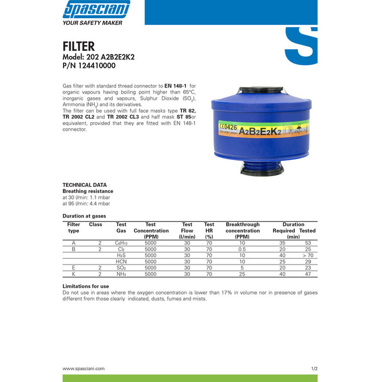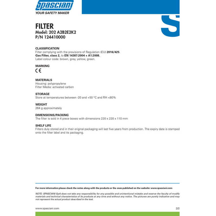 Spasciani یک کمپانی ایتالیایی در زمینه طراحی و ساخت انواع تجهیزات حفاظت فردی و ایمنی است. هسته اولیه این کمپانی در سال 1892 و با تولید ماسکهای تنفسی شکل گرفت. اسپاسیانی در سال 2019 با خرید شرکت اسپانیایی NUEVA SIBOL به مهمترین قطب تولید ماسک صورت و فیلتر کارتریج در اروپا تبدیل شد. فیلتر چهارحالته A2B2E2K2 از جمله فیلترهای گاز سری 200 Spasciani است. این سری فیلترها دارای اتصال رزوه استاندارد EN 148-1 هستند و شامل فیلترهای ذرات معلق کلاس P3، فیلترهای گاز کلاس 2 و فیلترهای ترکیبی کلاس 1 و 2 P3 می شوند. این فیلتر شیمیایی در محیطهای با بخارات آلی با نقطهجوش بالاتر از 65 درجه سانتیگراد، گازها و بخارات معدنی، گوگرد دیاکسید (SO2)، آمونیاک (NH3) و مشتقات آن مورد استفاده قرار میگیرد. این سری کارتریجها را میتوان با ماسک شیمیایی نیمصورت ST 85 و ماسکهای تمامصورت TR 82 و TR 2002 استفاده کرد، مشروط بر اینکه دارای کانکتور EN 148 1 باشند.باید توجه داشته باشید که در شرایطی که غلظت اکسیژن کمتر از 17 درصد است یا در شرایطی که گازهای متفاوتی از گازهای ذکر شده در محیط وجود دارد یا گرد و غبار در هواست نباید از این فیلتر استفاده کنید. این فیلتر بایستی در دمای بین 20- تا 50+ درجه سانتیگراد و با رطوبت کمتر از 80 درصد نگهداری شود.
