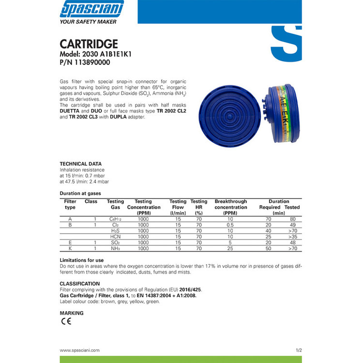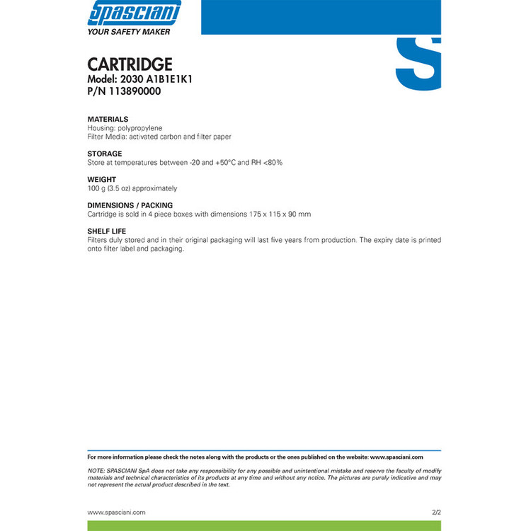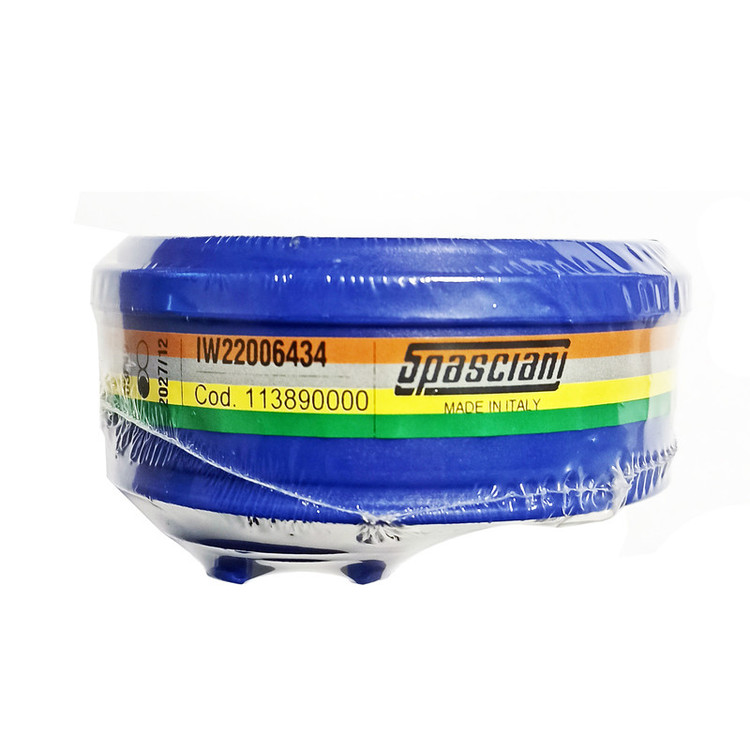 Spasciani یک کمپانی ایتالیایی در زمینه طراحی و ساخت انواع تجهیزات حفاظت فردی و ایمنی است. هسته اولیه این کمپانی در سال 1892 و با تولید ماسکهای تنفسی شکل گرفت. اسپاسیانی در سال 2019 با خرید شرکت اسپانیایی NUEVA SIBOL به مهمترین قطب تولید ماسک صورت و فیلتر کارتریج در اروپا تبدیل شد. این فیلتر چهار حالته از نوع فیلترهای گاز است که در محیطهای آلوده به بخارات آلی با نقطهجوش بالاتر از 65 درجه سانتیگراد، گازها و بخارات معدنی، گوگرد دیاکسید (SO2)، آمونیاک (NH3) و مشتقات آن مورد استفاده قرار میگیرد. از جمله ویژگی آن بدنه سبک و مقاوم ( ساخته شده از پلی پروپیلن) و جذب فوق العاده آلاینده ها (استفاده از کربن فعال و کاغذ صافی(پالونه) داخل کارتریج) می باشد. این کارتریج دارای class 1 مختص فیلترهای گاز منطبق با استانداردهای EN 14387:2004 + A1:2008 است.