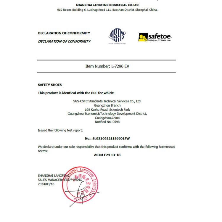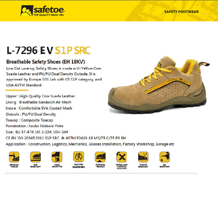 این کفش مدل L-7296 EV تولید شده در شرکت SAFETOE می باشد . کفش عایق برق فشار قوی 18 KV می باشد که جنس رویه کفش از چرم جیر گاوی با کیفیت بسیار بالا و فرآوری شده با فناوری تنفسی برای خشک نگه داشتن پا در تمام طول روز.می باشد . جنس استر از مش با تنفس بالای هوا تهیه شده است .در کف کفش از کفی های فوم مموری جذب شوک (ضربه گیر) فوق العاده راحت، برای کار 24 ساعته باآرامش و بدون خستگی کامل.استفاده شده است . جنس زیره از PU دو دانسیته است و در صفحه وسطی کفش از صفحه KEVLAR انعطاف پذیر استفاده شده که ضد فرو رفتن میخ و یا اشیاء نوک تیز از زیره کفش می باشد . همچنین زیره آن سخت و مقاوم در برابر سایش است و طراحی کانال های در زیره جهت مقاومت در برابر لغزش برای جریان آب و روغن می باشد . جنس گلاهک سرپنجه از کامپوزیت با قابلیت تحمل 200 ژول ضربه می باشد . استانداردهای بکار گرفته شده در این کفش EN ISO 20345:2011 SBP+I SRC می باشد .